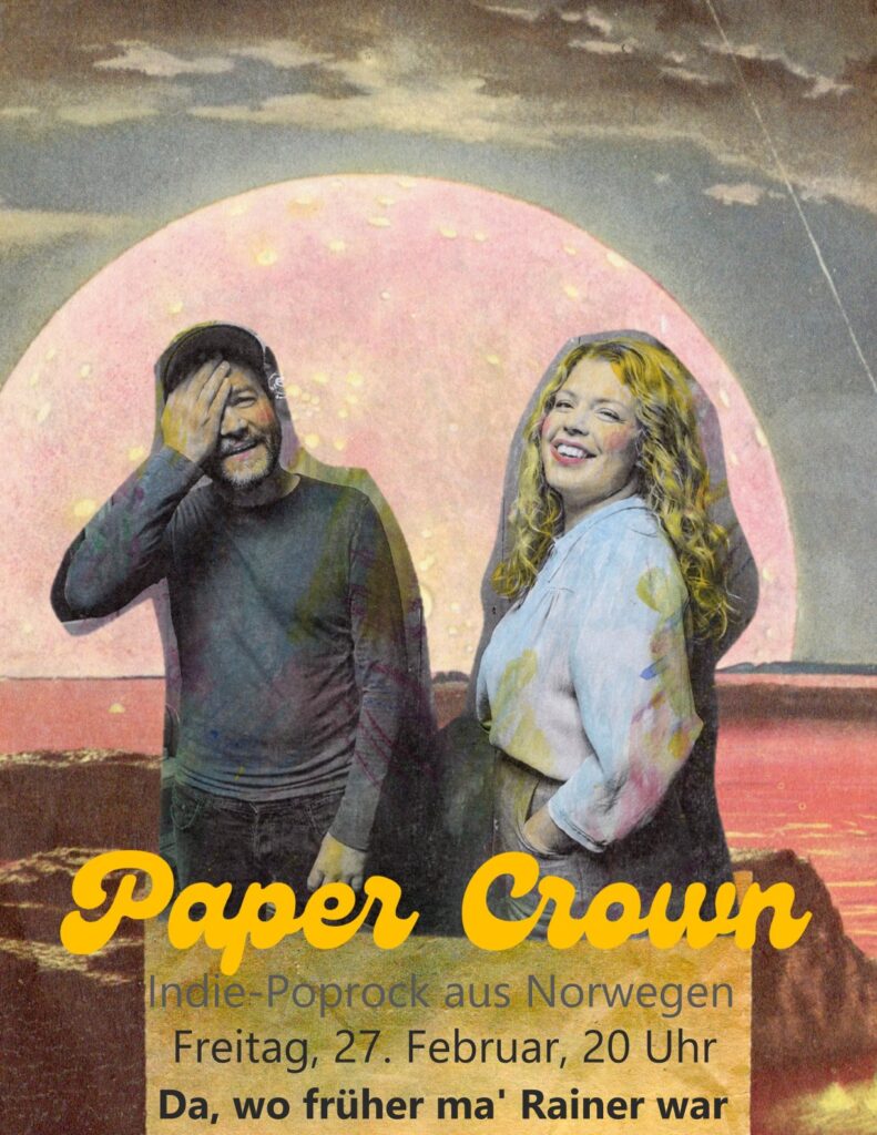 Am Freitag, den 27. Februar gibt das Duo „Paper Crown“ mit Indie-Pop aus Norwegen ein Konzert bei uns im Soziokulturellen Treff am Wilhelmsplatz. Beginn ist um 20:00 Uhr, Einlass ab 19:00 Uhr. Es geht der Hut rum.